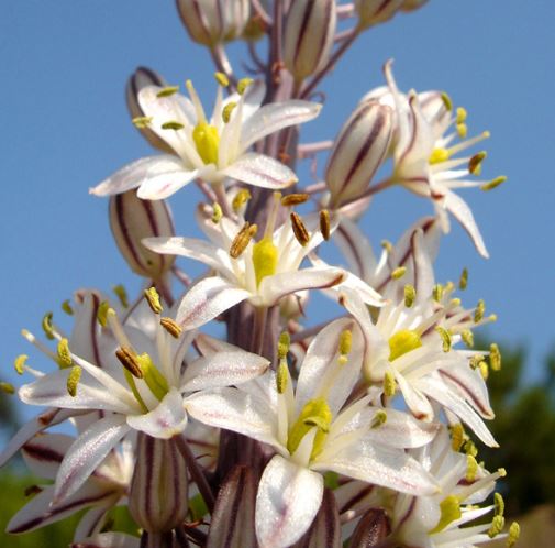 Urginea maritimaUrginea maritima Urginea maritima: Bloeit in de maanden juli-september en de hoogte is ongeveer 90 cm. De plant heeft grote bladeren en de bloem is wit van kleur met een lila blos. |