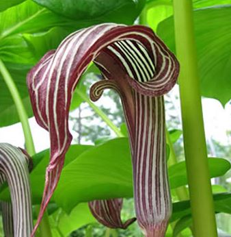 Arisaema flavum: Blüht im Mai-Juni und wird etwa 40-50 cm hoch. Die Farbe ist gelb mit lila auf der Innenseite.