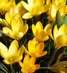 Crocus chrysanthus Fuscotinctus: Blüht im Frühjahr, etwa im März, und wird etwa 15 cm hoch. Die Blume hat eine goldgelbe Farbe mit etwas Braun auf der Außenseite.