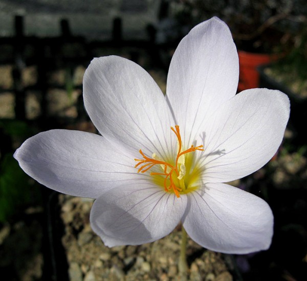 Crocus pulchellus Zephyr: Blüht im Herbst, etwa September-Oktober, und wird etwa 10 cm hoch. Die Blüte ist weiß mit einer weißgrauen Außenseite.