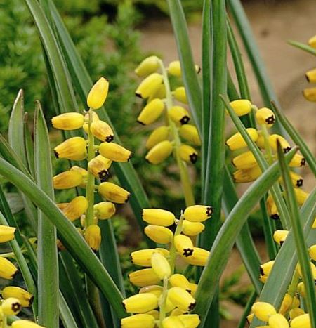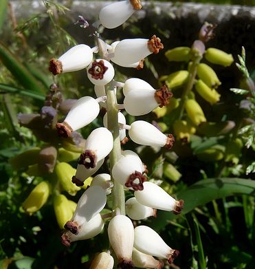 Muscari armeniacum Siberian Tiger ®: Blüht im Mai und wird etwa 15-20 cm hoch. Die Blüte hat eine reinweiße Farbe.