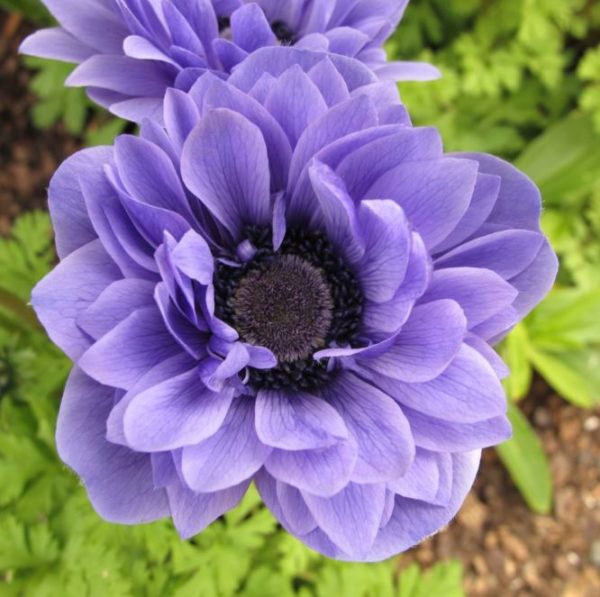 Anemone coronaria Lord Lieutenant: The flowering period is from June to October. The height is about 30 cm. The full flower has a blue color. Own cultivation.