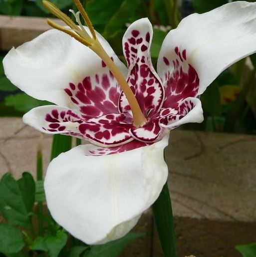 Tigridia pavonia Speciosa: Flowers in the months of July-October and becomes 45 cm high. The flower is scarlet in color with a yellow-red speckled throat.