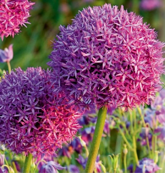 Allium giganteum: Bloeit rond juni en wordt wel 150 cm hoog, een echte reus. Het heeft een stevige steel en een grootbloemige, purperen bloem.